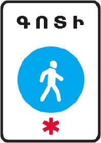 «Կույր հետիոտներ». տեղեկացնում է, որ հետիոտնային անցումից օգտվում են կույրերը: Կիրառվում է 1.22, 5.19.1 և 5.19.2` «Հետիոտնային անցում» նշանների և լուսացույցների հետ. | ||||||